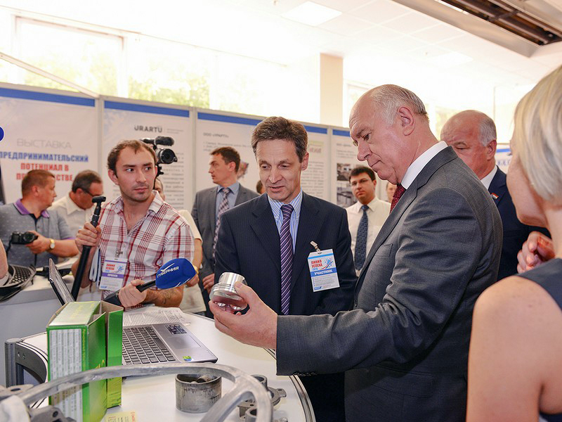 Директор ООО "Литейный завод "СамЗАС" Хмара Д.В. показывет образцы продукции на стенде губернатору Самарской области Н.И. Меркушкину